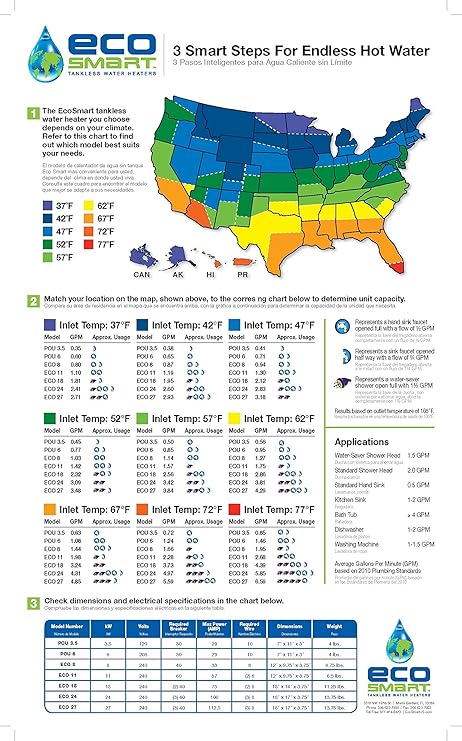 While this unit won t keep up with some of the larger water heating units on the market it provides plenty of hot water enough for two showers to run at the same time but comes at a price that is much more affordable for most families. For cool climates this electric tankless water heater can handle a shower and a sink whereas in warmer climate it can handle two showers and two sinks. Ecosmart eco 11 13kw at 240 volts ecosmart eco 18 18kw at 240 volts both are electric heating units which means that they don t require flames and burners like natural gas models do and installation doesn t involve complicated venting and exhaust systems. Français eco chauffe eau électrique sans réservoir.